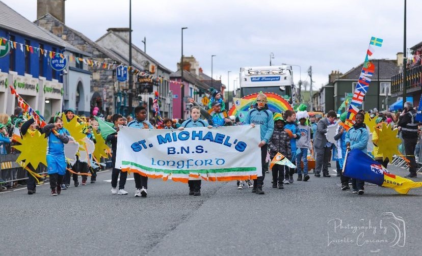 St Michael’s once again entered a float into the St Patrick’s Day parade in Longford. The boys under the guidance of Mrs. Quinn, Ms. Barrins, Ms. Lennon and Mr Delaney helped to create the pieces needed for the parade. The theme this year was ‘Amuigh Faoin Spéir’. The boys created clouds, suns and a large rainbow to show the sky, We had a weather man too. The rest of the boys dressed in the School sports kits to represent the activities we enjoy doing ‘amuigh faoin speir’ or under the sky. We also had flags from lots of different countries to represent the diversity of our school community.